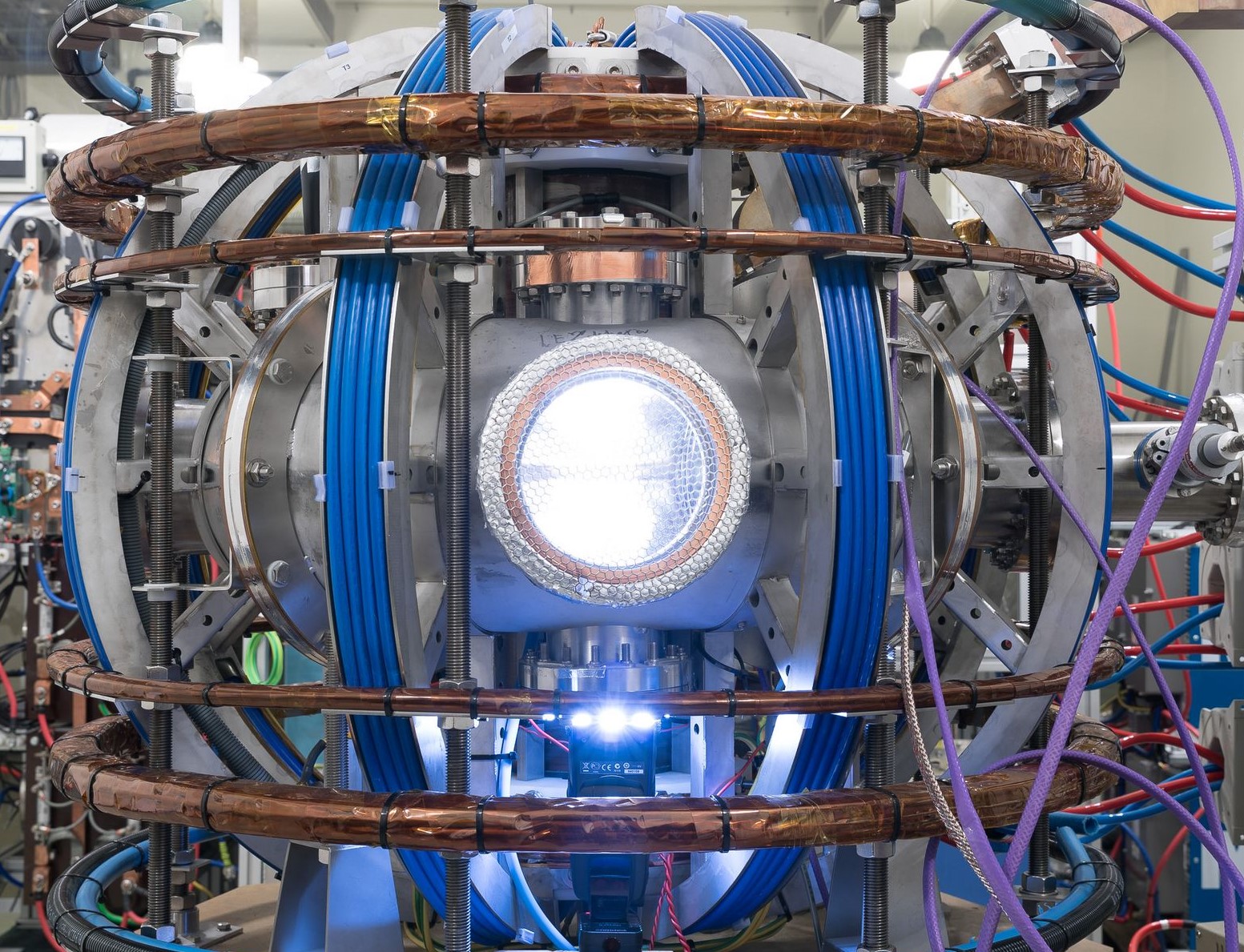 A spherical tokamak is a more compact version of the tokamak designs originally developed in the former Soviet Union. Tokamaks can confine plasma with temperatures above 200.000.000 C, which is 10 times the temperature in the centre of the Sun. The warm plasma is confined using advanced magnetic fields and the high temperatures are achieved by heating with electromagnetic waves and neutral beam injection.